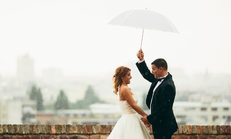 Ask vendors how they handle rain (backup gear, covered staging) and confirm venue rain plans in writing. If you’re outdoors with no indoor alternative, special-event (wedding) insurance can help if severe weather forces a cancellation or postponement—policies and coverage vary, so compare and read the fine print.